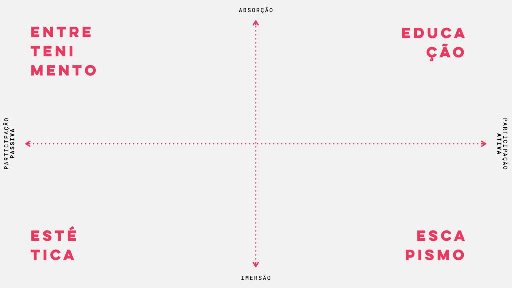 Como você pode ver, as etapas de entretenimento e de educação são voltadas para a absorção da ideia de produtos, conceito dos serviços e como o que é vendido soluciona problemas. Já os pilares de estética e escapismo são projetados para imersão do consumidor na ideia de marca, algo constantemente feito em espaços físicos de varejo.